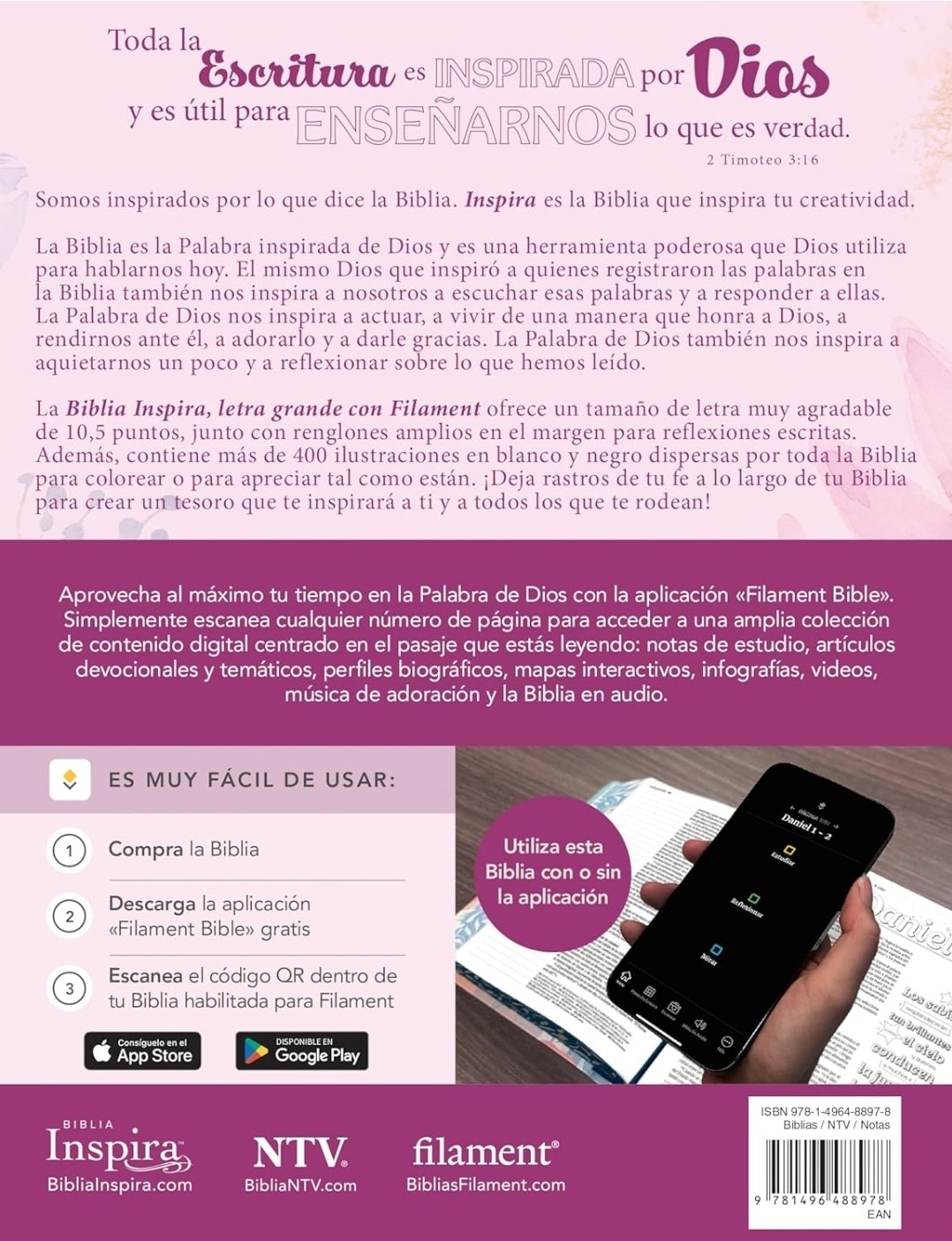 La Biblia Inspira Filament Primaveral combina la belleza de las ilustraciones con el texto bíblico, diseñada para ofrecer una experiencia de lectura inspiradora y profunda. Su formato físico facilita la lectura, el estudio personal y el devocional diario.