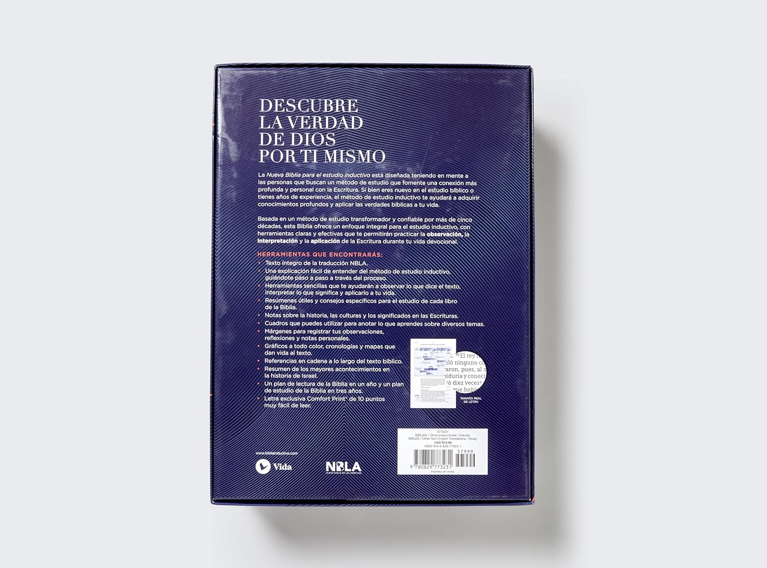 La Biblia NBLA estudio inductivo incluye una armonía de los Evangelios, un plan de lectura adaptable a 1 o 3 años, y un resumen histórico de Israel. Su tipografía Comfort Print® cuida tu vista durante largas sesiones de lectura, y el espacio para anotaciones personales convierte cada página en una experiencia única.